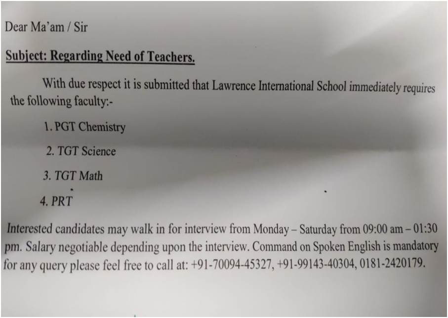 Lawrence International School is currently seeking to hire faculty for the positions mentioned above. Interested candidates are encouraged to apply. Kindly share this requirement with your previous batch of students who may be interested in these opportunities.